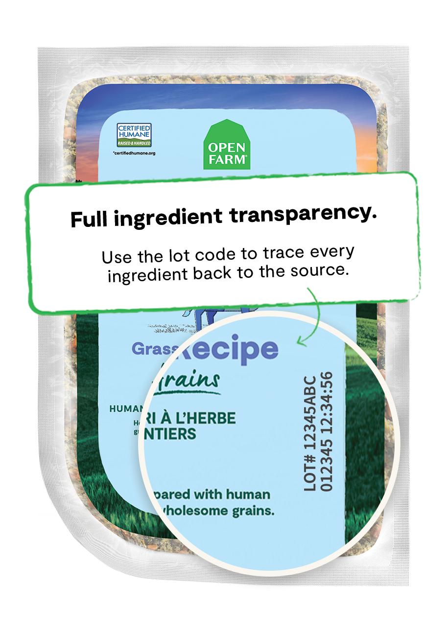 We also believe that every ingredient your pet eats should be accounted for, that's why every ingredient in our Freshly Crafted recipes is 100% traceable. You can trace every ingredient to its geographic origin, see safety test results, and more. We know you're obsessed about your pet, so we obsessed about transparency in the food they eat. That's the Open Farm difference.