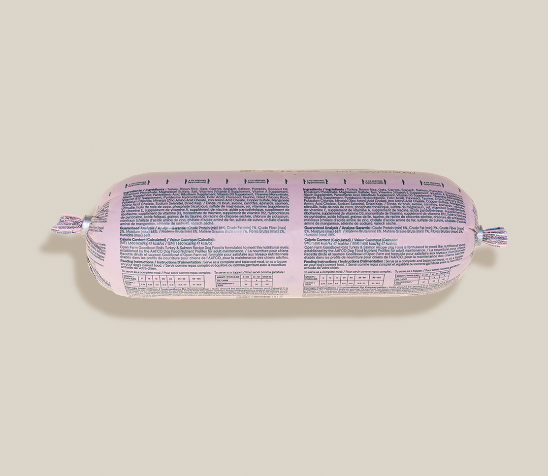 This fresh slice and serve recipe is packed with protein and nutrients featuring a vet approved mix of humanely turkey, Ocean Wise recommended salmon and non-GMO veggies and grains– all human-grade ingredients. This recipe ships frozen in rolls to preserve freshness and flavor for longer! Just thaw and serve when you're ready to feed.