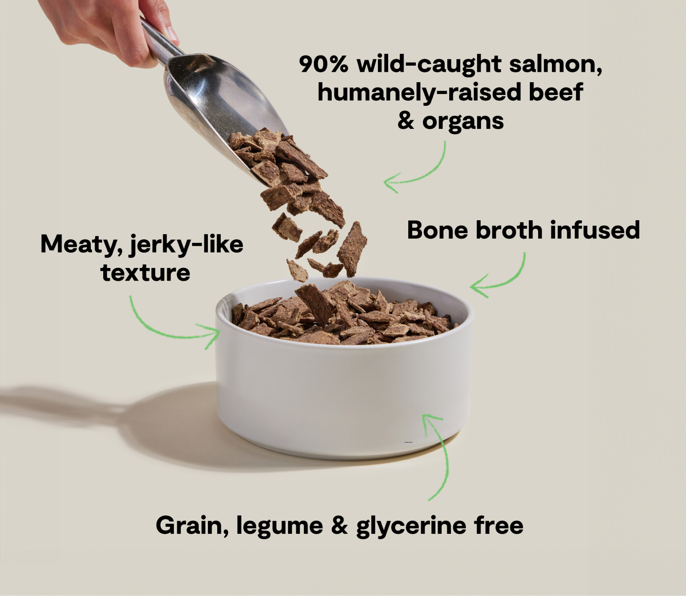 This meaty, jerky-like recipe is gently air-dried at low temperatures to naturally preserve nutrition and mouth-watering taste. Crafted with 90% Ocean Wise recommended wild-caught salmon and animal welfare certified beef & beef organs, this recipe is the perfect mealtime alternative for pet parents looking to explore beyond traditional kibble. In addition, bone broth and a superfood blend of non-GMO fruits and vegetables are added to provide a nutrient dense, complete and balanced meal or topper.