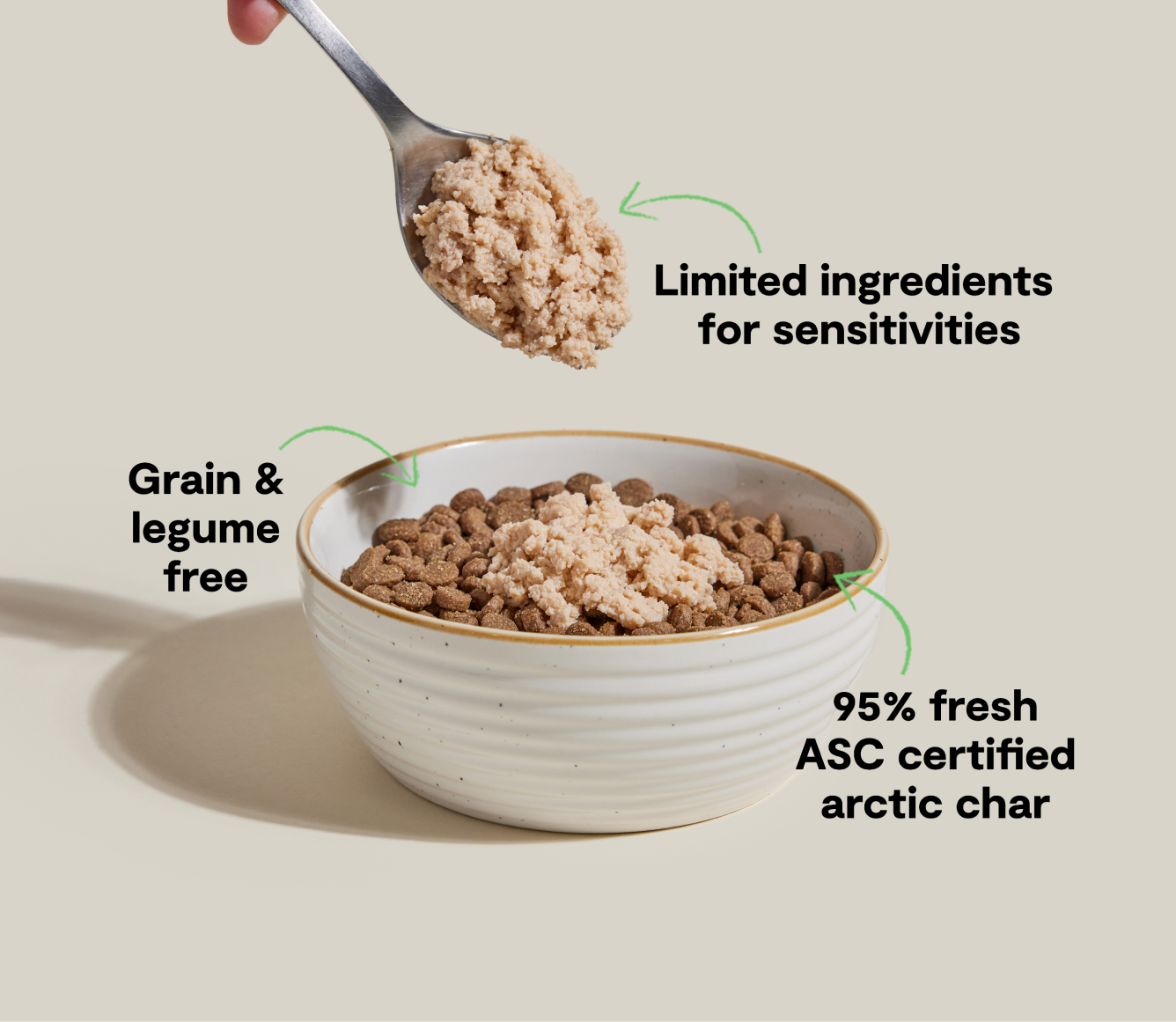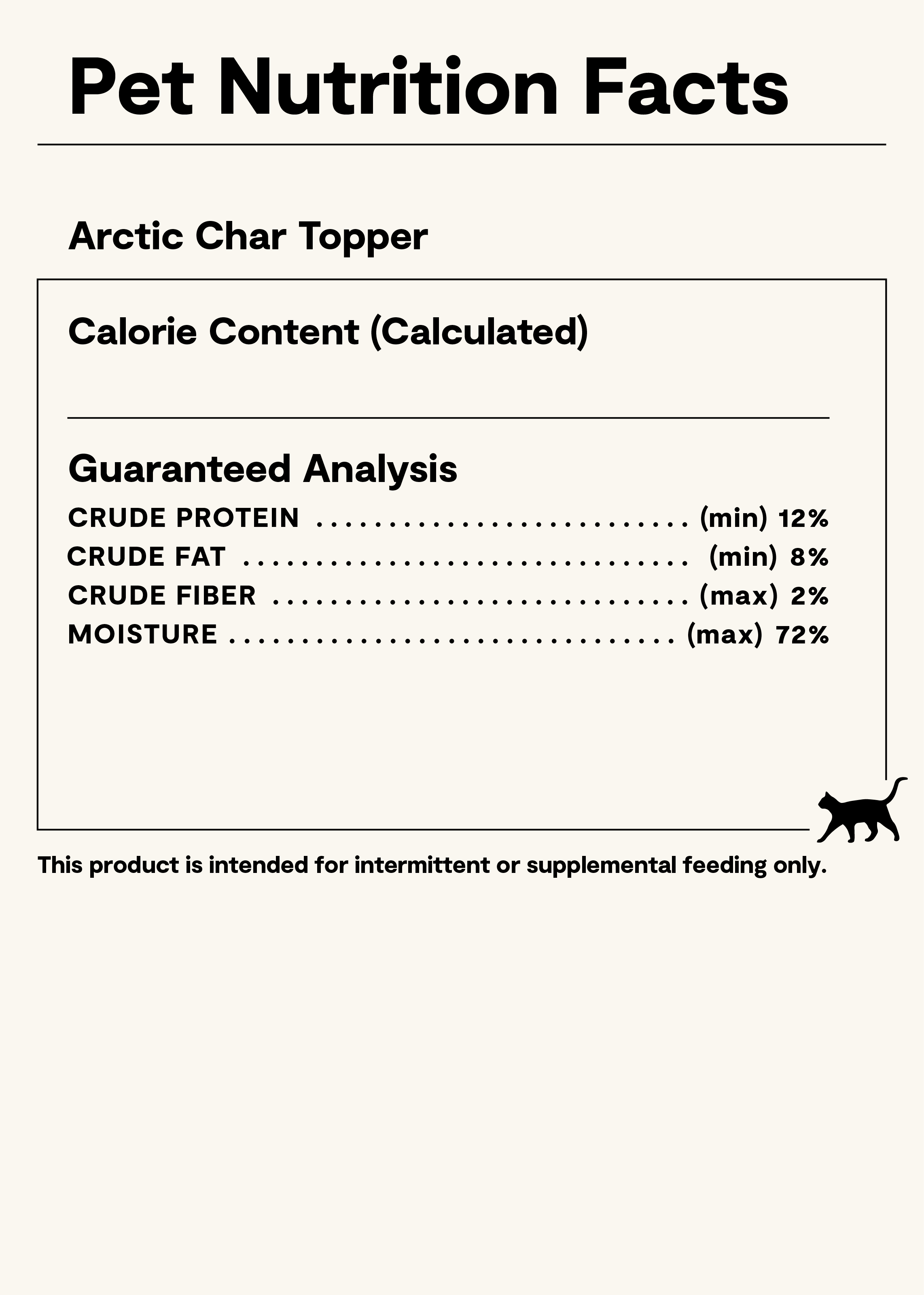 Crafted with 95% fresh Icelandic Arctic Char, this silky mousse is a delicious and nutritious way to add instant texture and variety to your cat's bowl. Grain- and legume-free and made in a human-grade facility with 100% human grade ingredients.