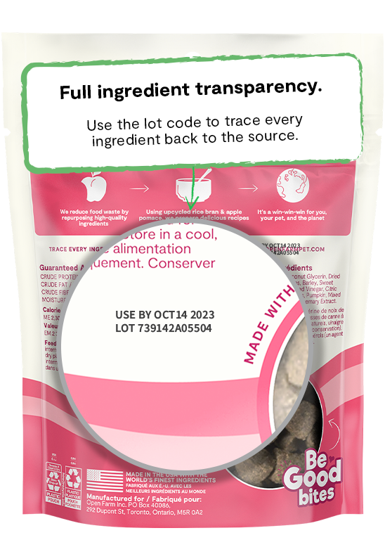 Just as with our recipes, we are also committed to transparency by sharing everything pet parents need to know about what’s in their pup's treat jar. That’s why, for every Open Farm treat, you will find the geographic origin of each ingredient, safety test results for each treat, third-party certification details, and information on carbon emissions.