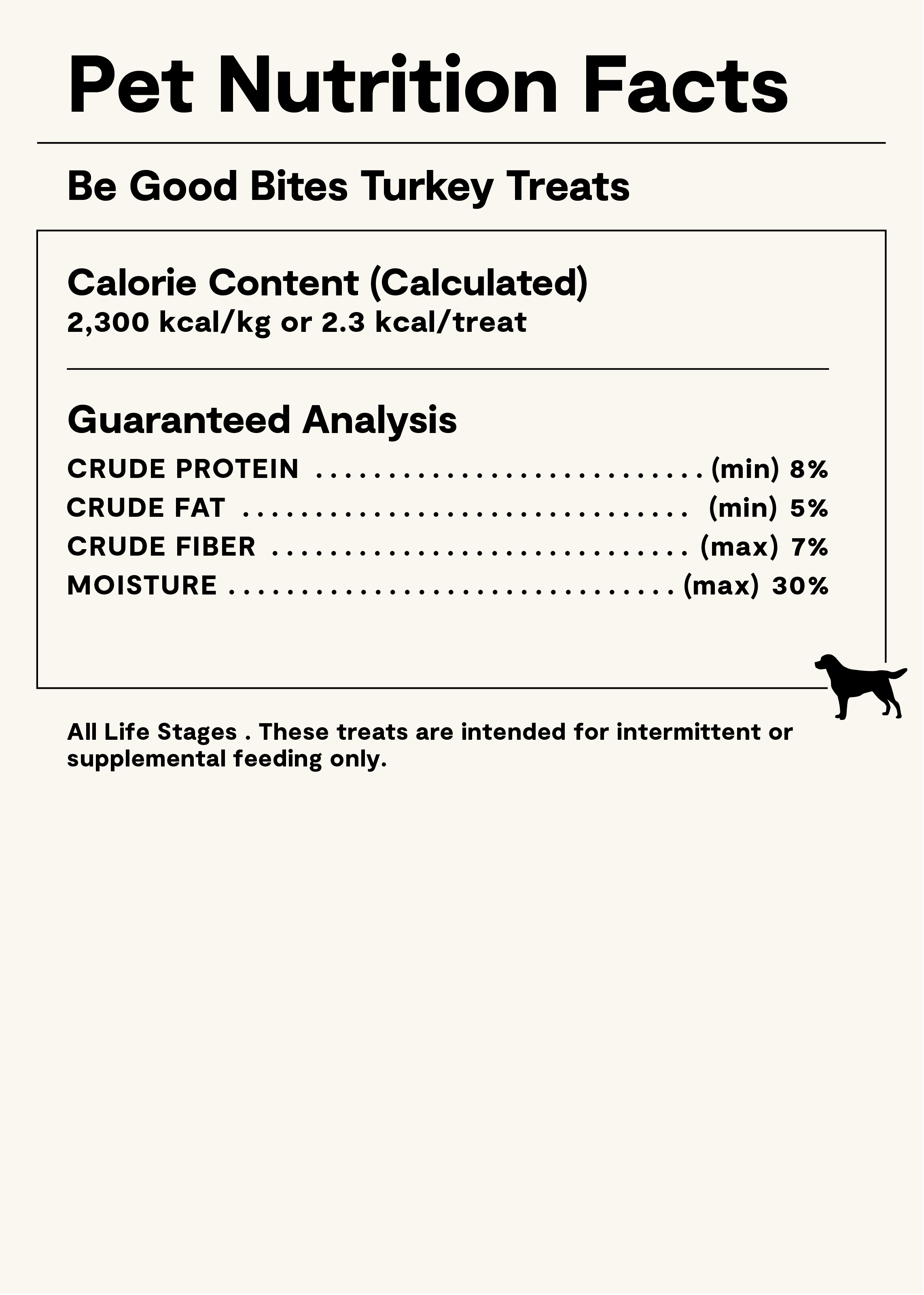 Calorie Content: ME (Calculated): 2,300 kcal/kg or 2.3 kcal/treat