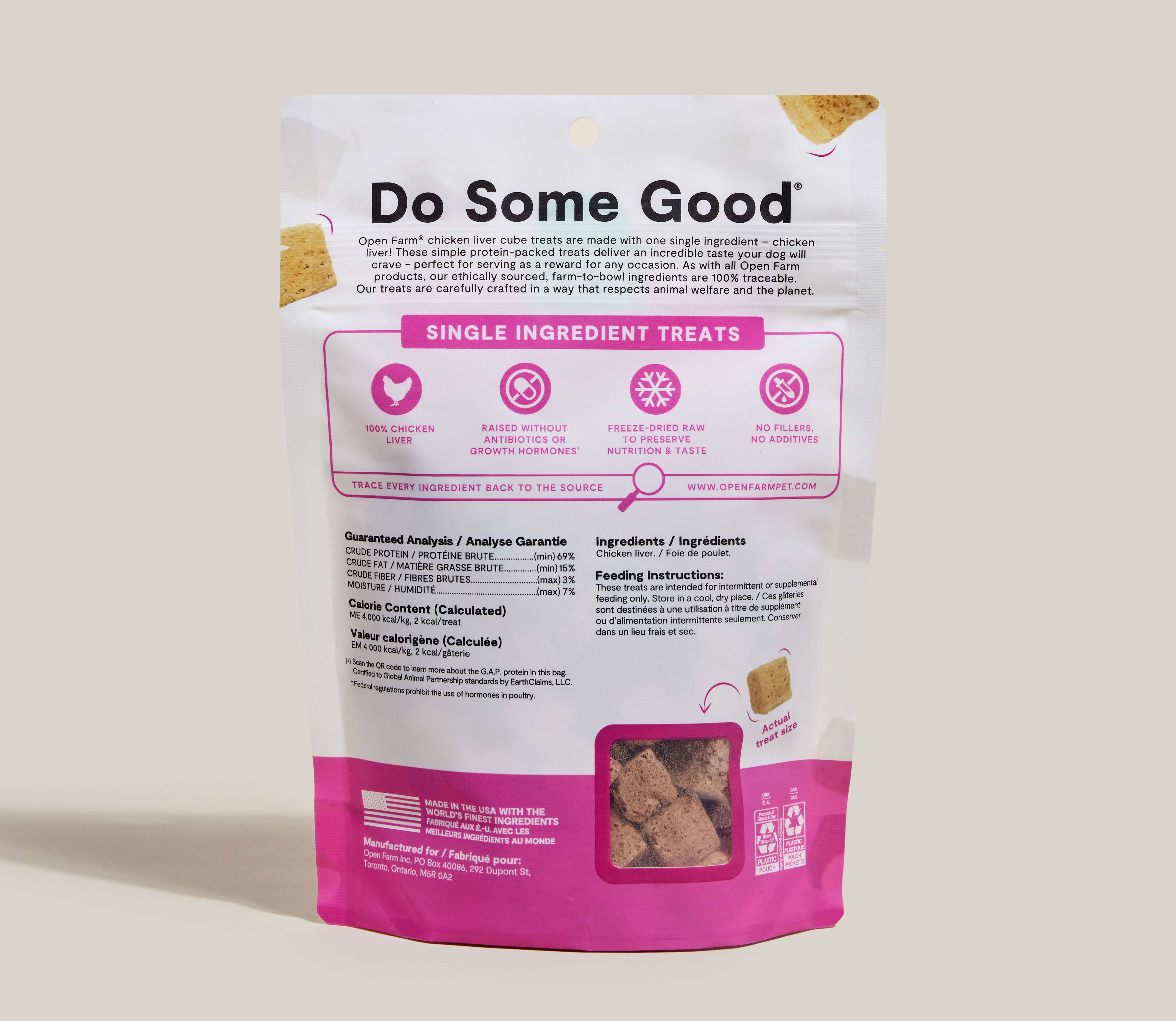 Just as with our recipes, we are also committed to transparency by sharing everything pet parents need to know about what’s in their pup's treat jar. That’s why, for every Open Farm treat, you will find the geographic origin of each ingredient, safety test results for each treat, third-party certification details, and information on carbon emissions.