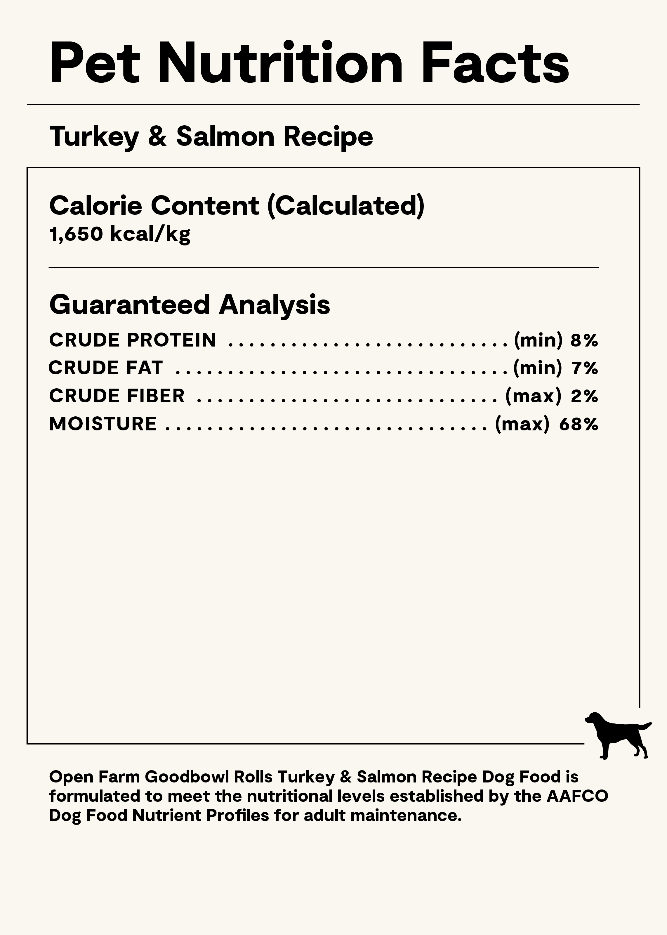 This fresh slice and serve recipe is packed with protein and nutrients featuring a vet approved mix of humanely turkey, Ocean Wise recommended salmon and non-GMO veggies and grains– all human-grade ingredients. This recipe ships frozen in rolls to preserve freshness and flavor for longer! Just thaw and serve when you're ready to feed.