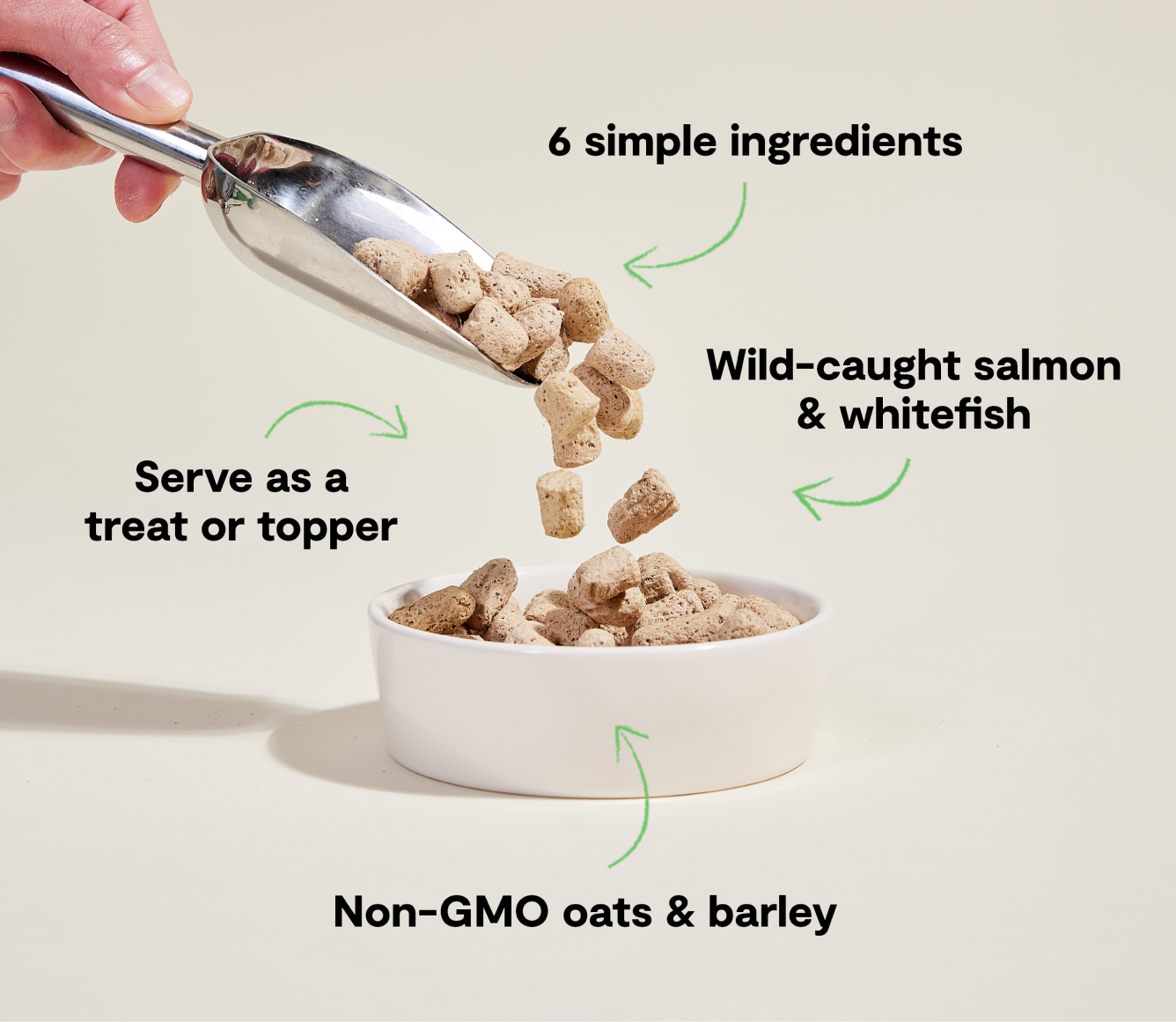 Made with 6 simple ingredients, these easy-to-serve meal mixers are a great way to add the power and taste of raw to your dog’s diet. Each morsel is packed with 70% wild-caught fish, combined with wholesome, non-GMO oats and barley. Great for picky eaters and making mealtime special.