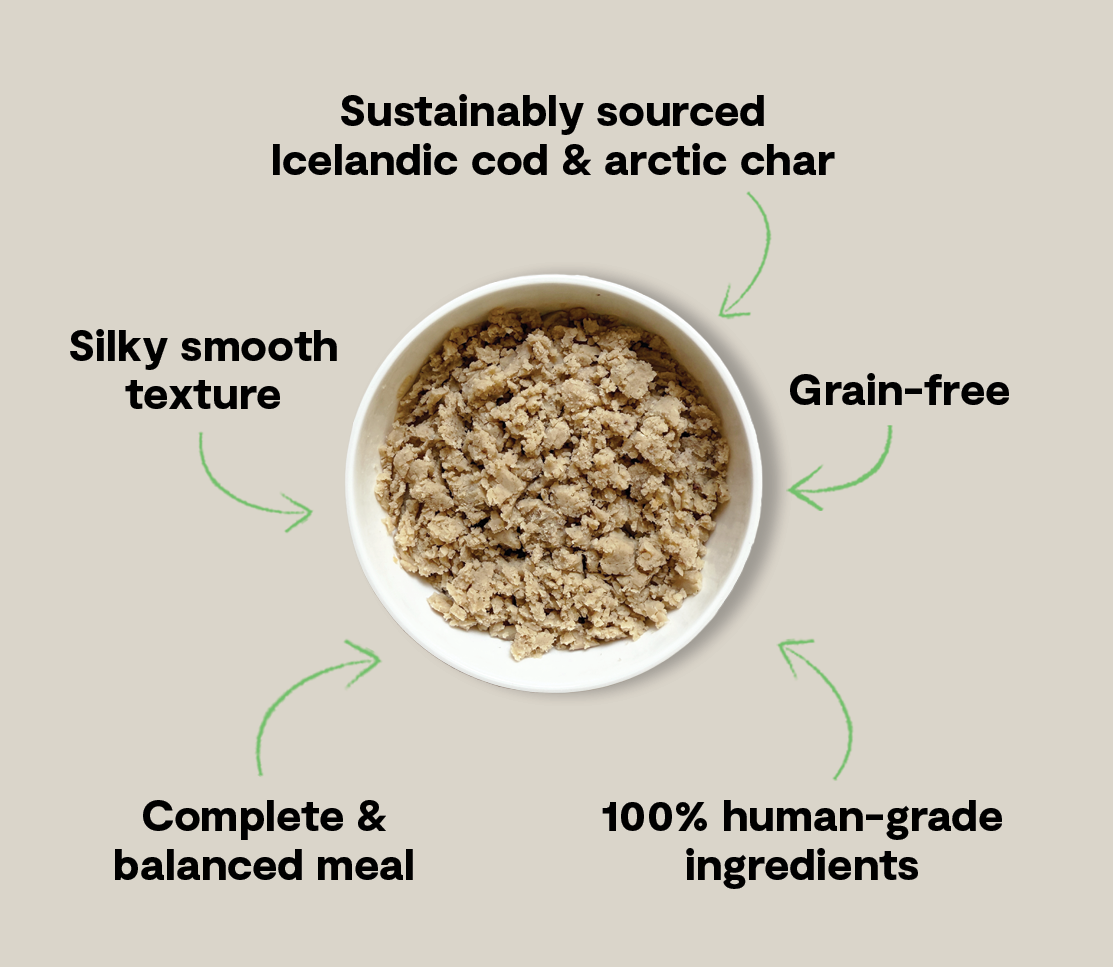 This complete and balanced meal is made with Icelandic MSC certified cod and ASC certified arctic char, combined with non-GMO superfoods like cranberries to create an irresistible flavor that your dog will crave! This recipe is made in a human grade facility with 100% human grade ingredients.