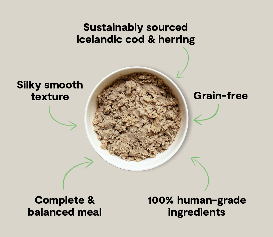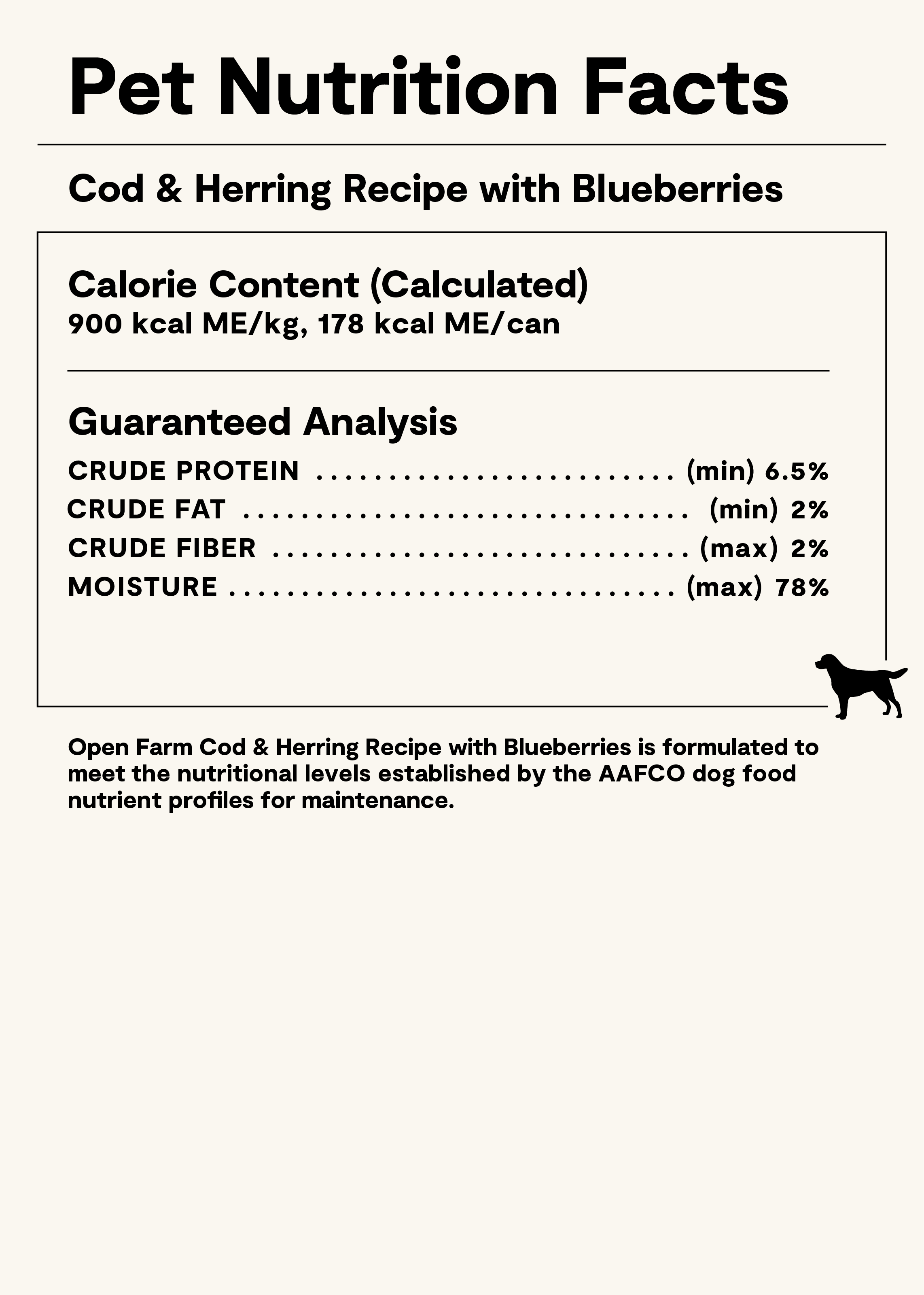 This complete and balanced meal is made with Icelandic MSC certified cod and herring, combined with non-GMO superfoods like blueberries to create an irresistible flavor that your dog will crave! This recipe is made in a human grade facility with 100% human grade ingredients.
